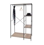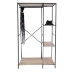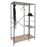 Ντουλάπα ανοιχτή ξύλινη, αποτελούμενη από τρία ράφια, κρεμάστρα και αποθηκευτικό χώρο στο κάτω μέρος, στιβαρή και σταθερή με μαύρο μεταλλικό σκελετό.