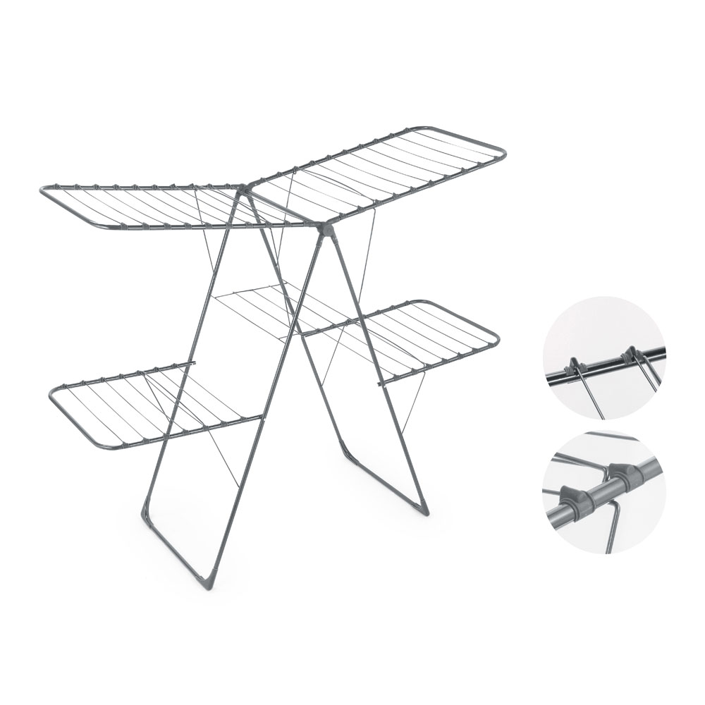Απλώστρα μεταλλική διώροφη, ιδανική για το στέγνωμα ρούχων σε εσωτερικούς και εξωτερικούς χώρους. Διαθέτει μεγάλο συνολικό μήκος απλώματος έως 30 μέτρα, προσφέροντας άνεση ακόμη και για μεγάλες ποσότητες ρούχων. Ο πρακτικός σχεδιασμός με δύο επίπεδα και αναδιπλούμενα πλαϊνά φτερά επιτρέπει ευέλικτη χρήση και εξοικονόμηση χώρου. Είναι κατασκευασμένη από ανθεκτικό μεταλλικό σκελετό με ηλεκτροστατική βαφή, που προστατεύει από τη φθορά και την υγρασία, ενώ τα ενισχυμένα σημεία σύνδεσης εξασφαλίζουν επιπλέον αντοχή στην καθημερινή χρήση. Διπλώνει εύκολα για άνετη αποθήκευση, αποτελώντας μια πρακτική και λειτουργική λύση για κάθε νοικοκυριό.