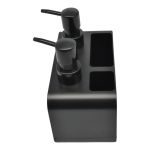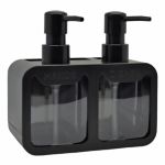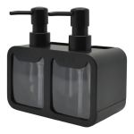 Διπλό πλαστικό dispenser σε μαύρο χρώμα, με διαφανή δοχεία και ανάγλυφες ενδείξεις HANDS και DISHES για υγρό σαπούνι χεριών και απορρυπαντικό πιάτων. Στο πίσω μέρος διαθέτει πρακτικές θήκες για αποθήκευση σφουγγαριών ή άλλων μικρών αντικειμένων.