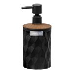 Σαπουνοθήκη για υγρό σαπούνι πλαστική σε μαύρο χρώμα με ανάγλυφη διακόσμηση διαμαντιού, εφέ ξύλου στο καπάκι και αντλία σε μαύρο ματ χρώμα. Αξεσουάρ μπάνιου εξαιρετικής ποιότητας με μοντέρνο και κομψό σχεδιασμό.