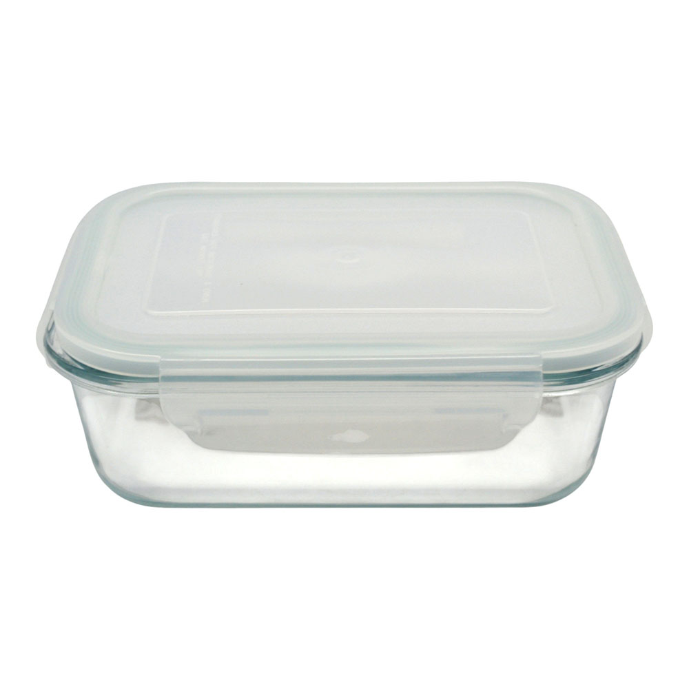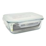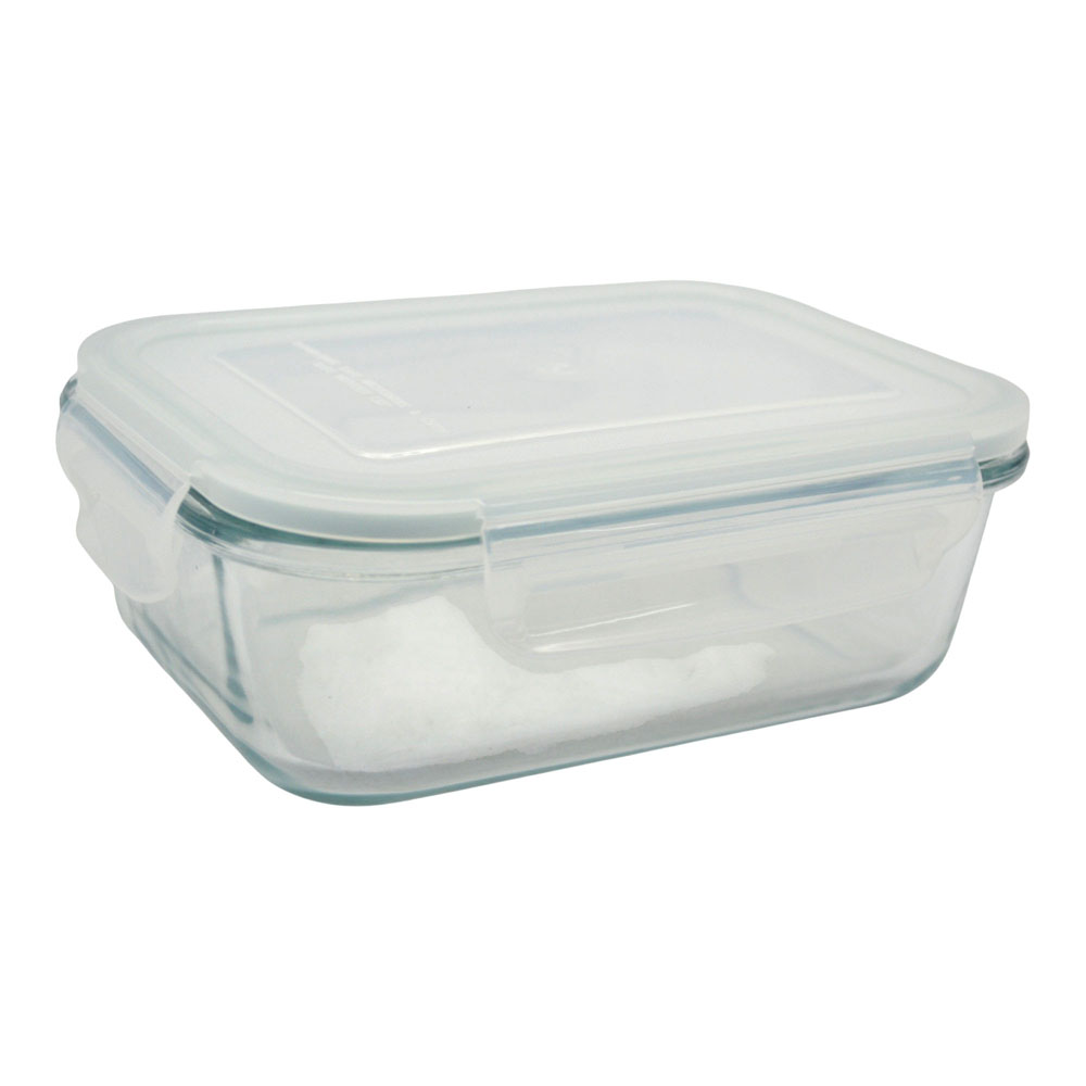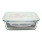 Ορθογώνιο φαγητοδοχείο από βοριοπυριτικό πυράντοχο γυαλί με πλαστικό καπάκι ασφαλείας και προστατευτικό περίβλημα σιλικόνης. Ανθεκτικό σε διαρροές και BPA free, διατηρεί το φαγητό φρέσκο και ασφαλές.