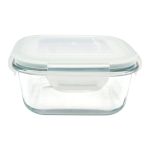 Τετράγωνο φαγητοδοχείο από βοριοπυριτικό πυράντοχο γυαλί με πλαστικό καπάκι ασφαλείας και προστατευτικό περίβλημα σιλικόνης. Ανθεκτικό σε διαρροές και BPA free, διατηρεί το φαγητό φρέσκο και ασφαλές.