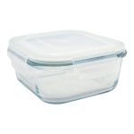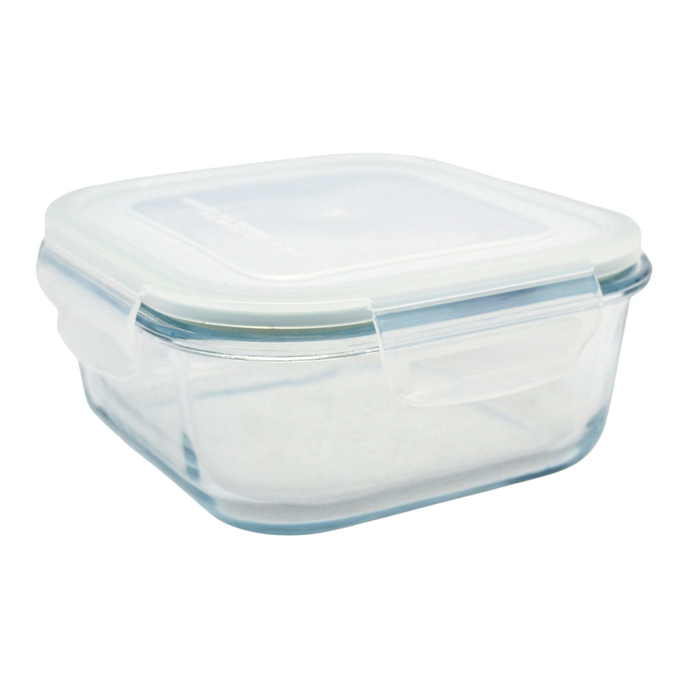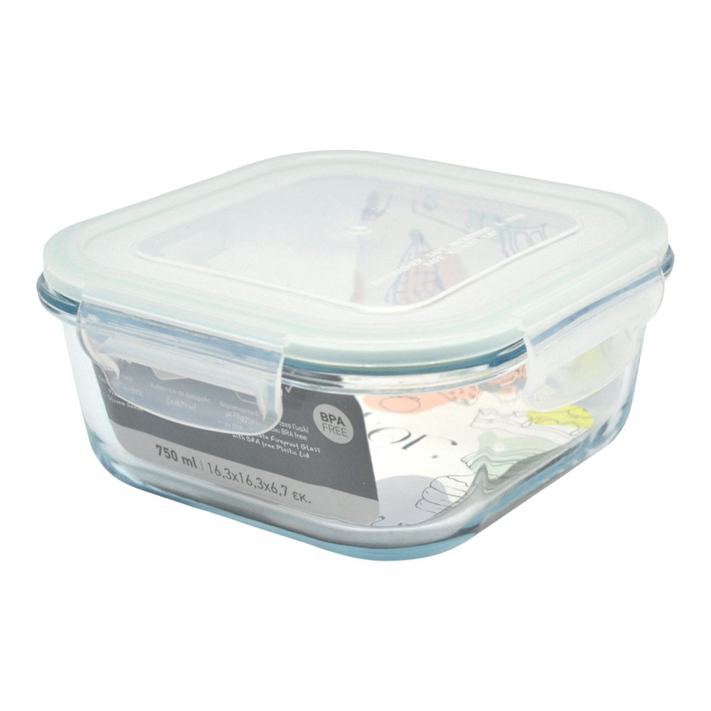 Τετράγωνο φαγητοδοχείο από βοριοπυριτικό πυράντοχο γυαλί με πλαστικό καπάκι ασφαλείας και προστατευτικό περίβλημα σιλικόνης. Ανθεκτικό σε διαρροές και BPA free, διατηρεί το φαγητό φρέσκο και ασφαλές.
