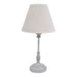 Φωτιστικό επιτραπέζιο μεταλλικό σε αντικέ γκρι χρώμα και υφασμάτινο μπεζ κωνικό καπέλο. Κατάλληλος τύπος λάμπας Ε14/40W max