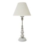 Φωτιστικό επιτραπέζιο μεταλλικό σε αντικέ γκρι χρώμα και υφασμάτινο μπεζ κωνικό καπέλο. Κατάλληλος τύπος λάμπας Ε14/40W max