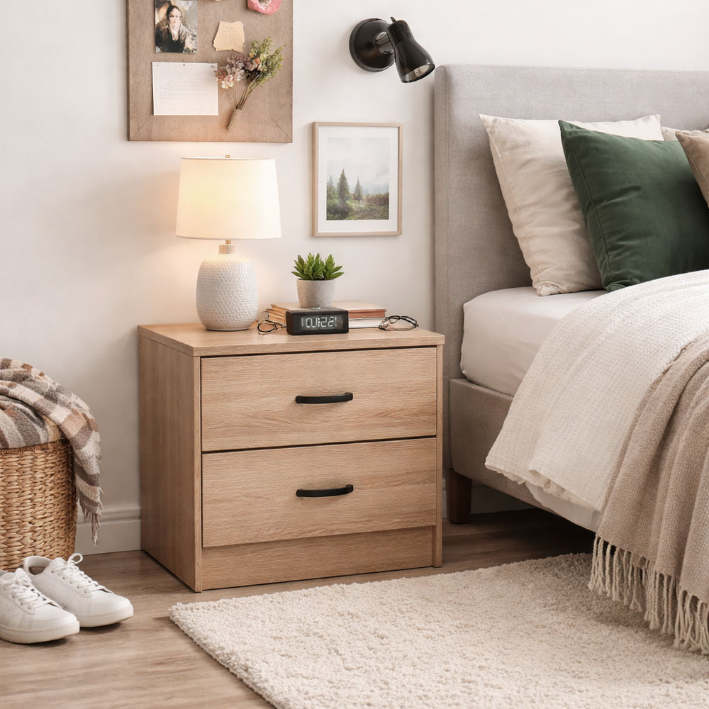 Κομοδίνο ξύλινο σε φυσικό χρώμα με δύο συρτάρια, ιδανικό για πρακτική αποθήκευση δίπλα στο κρεβάτι. Τα μαύρα χερούλια προσθέτουν μοντέρνες πινελιές σε έναν απλό και λειτουργικό σχεδιασμό που ταιριάζει σε κάθε υπνοδωμάτιο.
