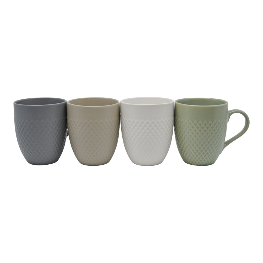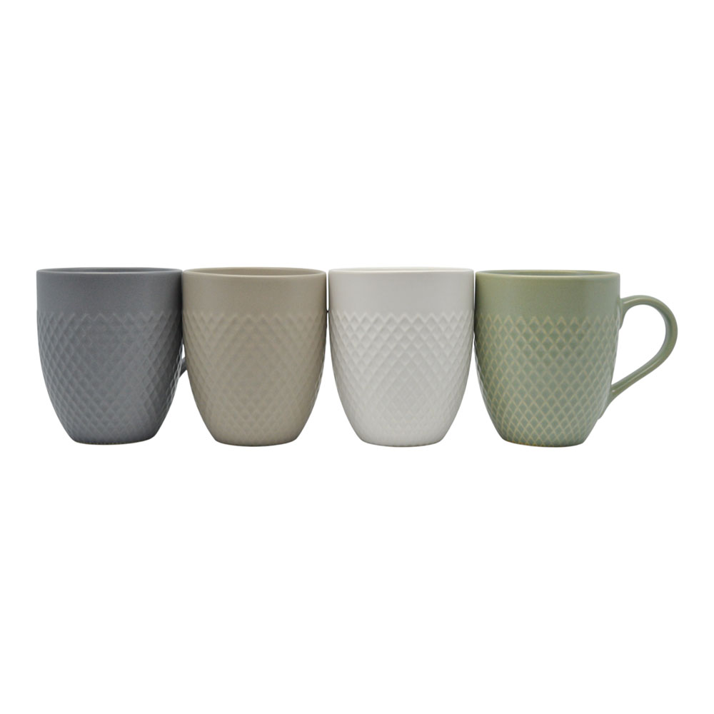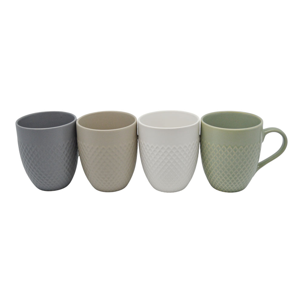Κεραμική κούπα σε αποχρώσεις γκρι, μπεζ, λευκό και απαλό πράσινο, με διακριτικό ανάγλυφο μοτίβο που προσθέτει κομψότητα. Κατάλληλη για πλυντήριο πιάτων και φούρνο μικροκυμάτων. Η συσκευασία περιλαμβάνει και τα τέσσερα χρώματα.