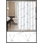 Κουρτίνα μπάνιου peva 0,8mm, αδιάβροχη, με λευκή βάση και σχέδιο εφέ μαρμάρου σε γκρι αποχρώσεις. Στην συσκευασία συμπεριλαμβάνονται δώδεκα πλαστικοί κρίκοι. Είναι εύκολη στο καθάρισμα, μαλακή και ευχάριστη αν έρθει σε επαφή με το δέρμα.
