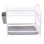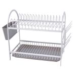 Διώροφη πιατοθήκη αλουμινίου με πλαστική θήκη για τα μαχαιροπίρουνα, ποτηροθήκες και πλαστικό δίσκο σε γκρι χρώμα.