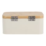 Μεταλλική ψωμιέρα σε μπεζ χρώμα, διακοσμημένη με κομψό σχέδιο βοτανικής έμπνευσης σε απαλούς τόνους και καπάκι από φυσικό bamboo. Ιδανική για την αποθήκευση ψωμιού και αρτοσκευασμάτων, προσθέτει μια φυσική πινελιά στον πάγκο της κουζίνας.