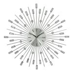 Ρολόι τοίχου μεταλλικό σε ασημί χρώμα, με εντυπωσιακό σχεδιασμό που θυμίζει ακτίνες ήλιου και διακόσμηση με διάφανους κρυστάλλους σε διαφορετικά σχήματα και μεγέθη. Συνδυάζει το κλασικό με το μοντέρνο, προσθέτοντας λάμψη και κομψότητα σε κάθε χώρο.