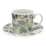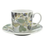 Σετ 6 τεμαχίων φλυτζάνια για καφέ με πιατάκια, κατασκευασμένα από πορσελάνη, με κομψό φυλλωτό σχέδιο σε αποχρώσεις του πράσινου και χρυσές λεπτομέρειες. Σερβίρετε και απολαύστε τον αγαπημένο σας καφέ. Κατάλληλα για χρήση στο πλυντήριο πιάτων.