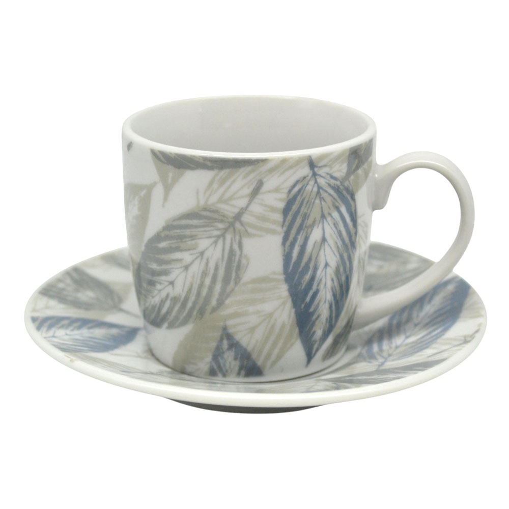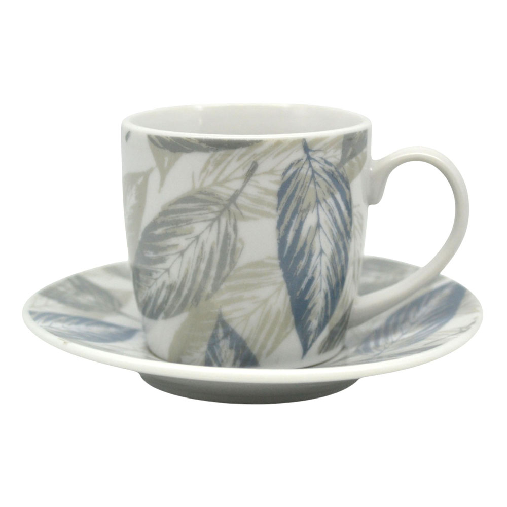 Σετ 6 τεμαχίων φλυτζάνια για καφέ με πιατάκια, κατασκευασμένα από πορσελάνη, με διακριτικό σχέδιο φύλλων σε γκρι και πετρολ αποχρώσεις και σε συσκευασία δώρου. Σερβίρετε και απολαύστε τον αγαπημένο σας καφέ. Κατάλληλα για χρήση στο πλυντήριο πιάτων.