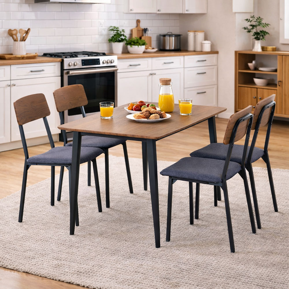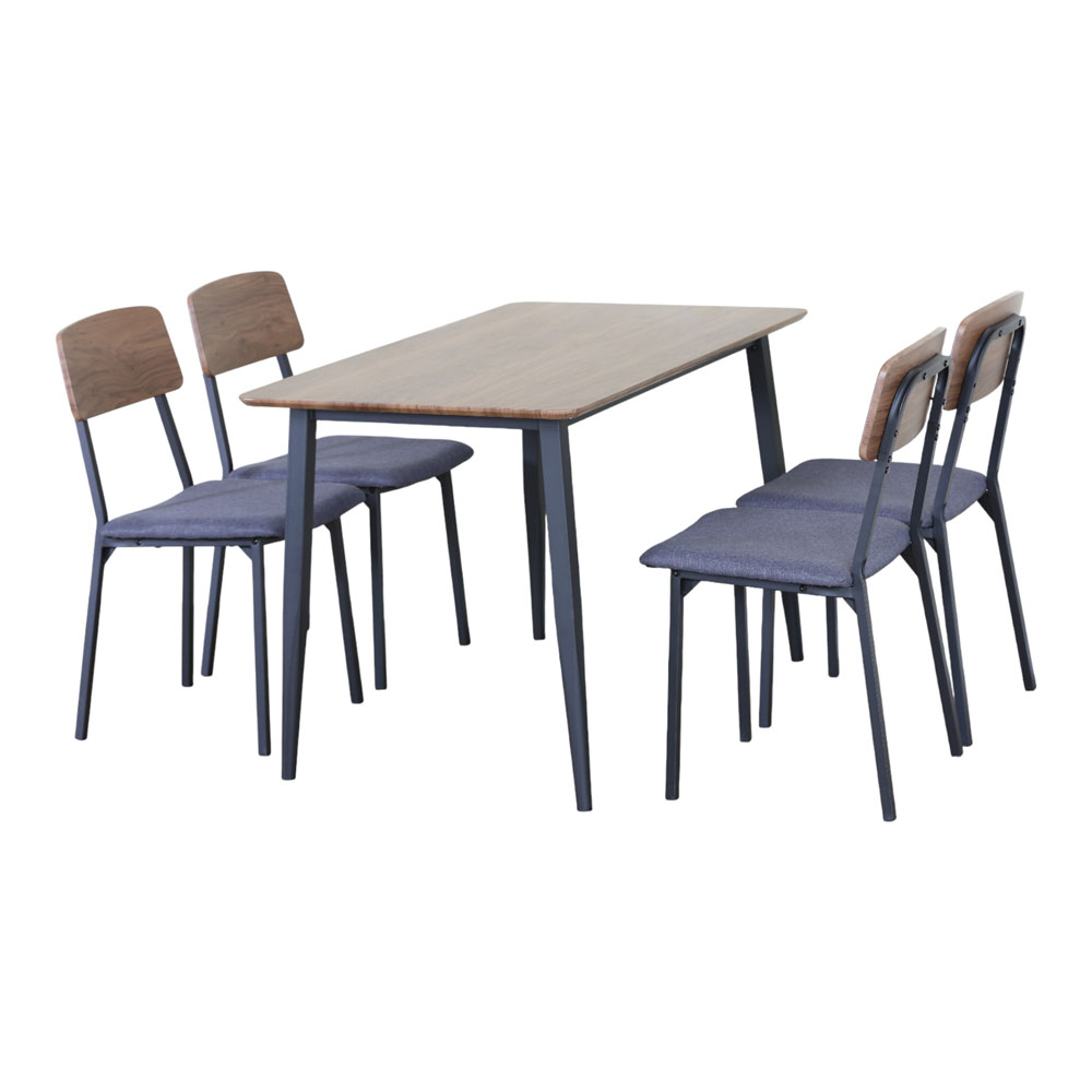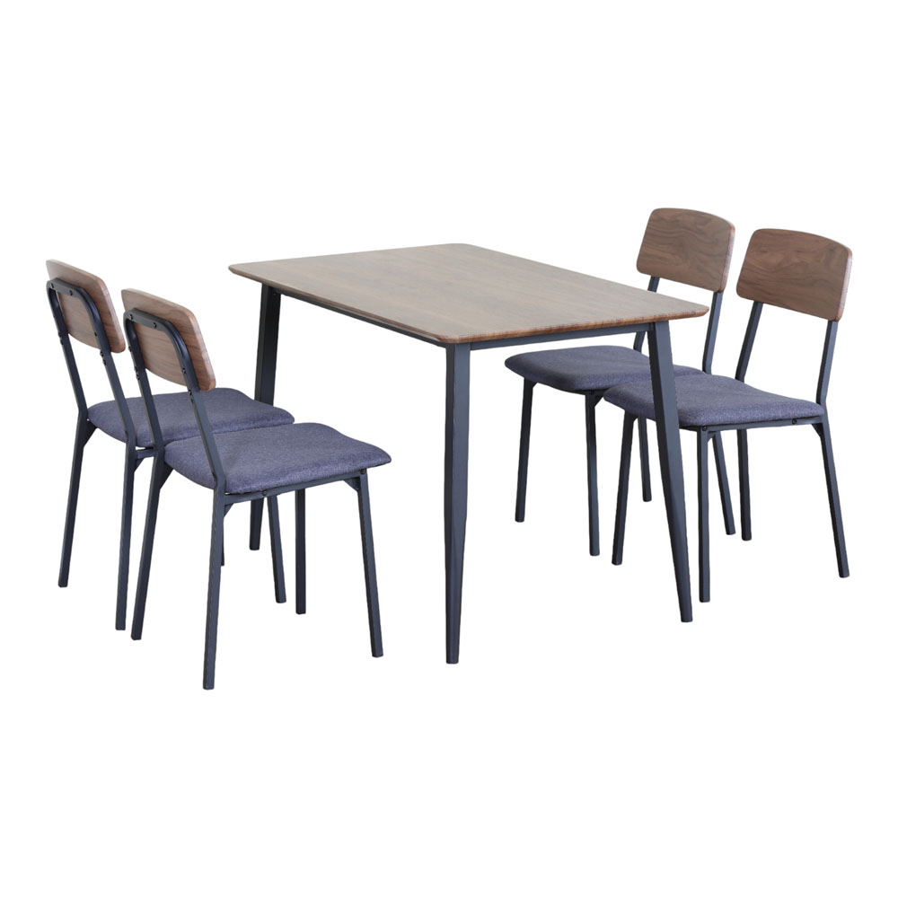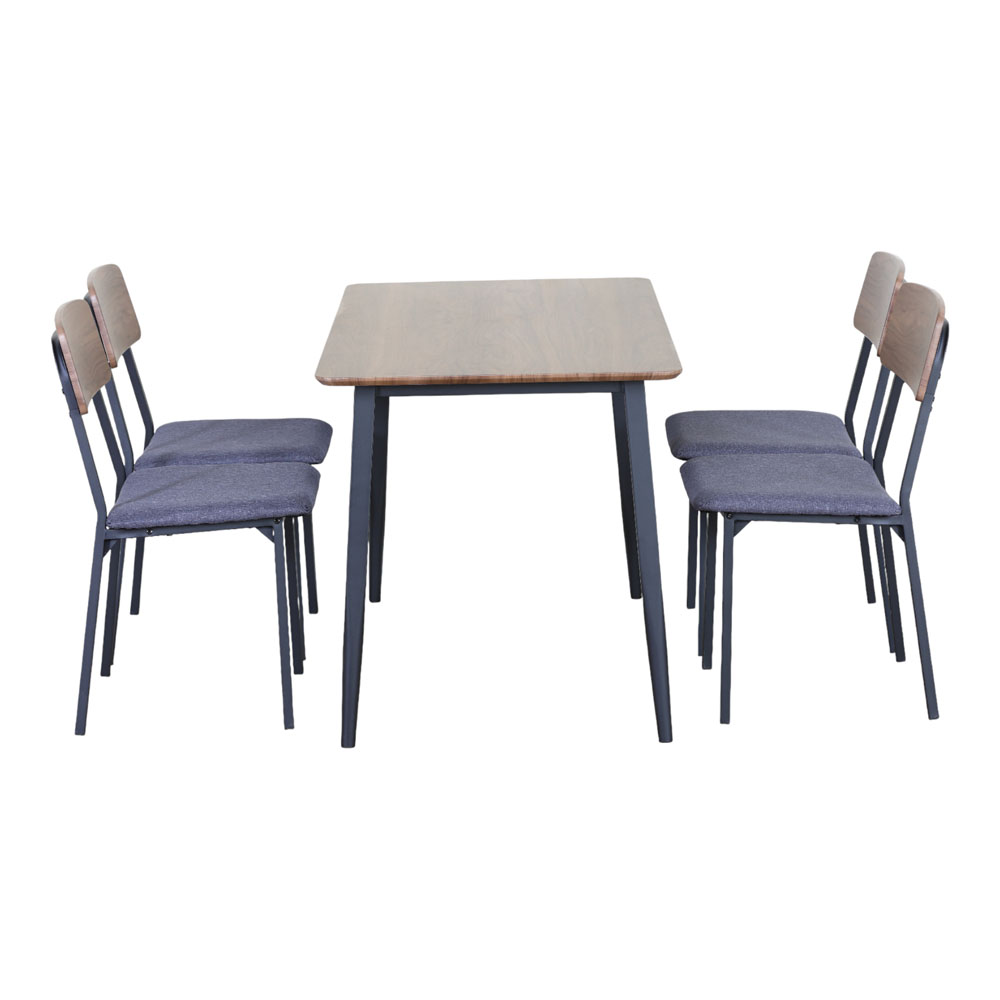 Σετ τραπεζαρίας το οποίο που περιλαμβάνει τραπέζι και 4 καρέκλες, ιδανικό για κουζίνα, τραπεζαρία ή φοιτητικό χώρο. Η επιφάνεια του τραπεζιού είναι κατασκευασμένη από MDF με επένδυση μελαμίνης, προσφέροντας αντοχή στη φθορά και εύκολο καθάρισμα. Οι καρέκλες διαθέτουν μεταλλικό σκελετό, με αναπαυτικό κάθισμα επενδυμένο με ύφασμα και ξύλινη πλάτη που συμπληρώνει αισθητικά το σύνολο. Διάσταση τραπεζιού 120x70x75εκ., διάσταση καρέκλας 45x42x82εκ.