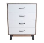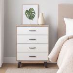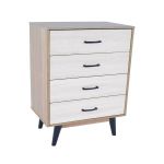 Συρταριέρα ξύλινη σε φυσικό χρώμα με τέσσερα άσπρα συρτάρια, κομψά πόδια και χερούλια για εύκολη χρήση σε μαύρο χρώμα. Είναι λειτουργική με μοντέρνο σχεδιασμό και διαχρονικό στυλ. Στην συσκευασία περιλαμβάνονται οδηγίες συναρμολόγησης.