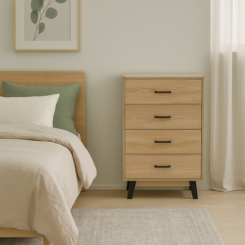Συρταριέρα ξύλινη σε φυσικό χρώμα με τέσσερα βαθιά συρτάρια (εξωτερικό ύψος 13εκ. εσωτερικό 11εκ.), κομψά πόδια και χερούλια σε μαύρο χρώμα. Είναι λειτουργική με μοντέρνο σχεδιασμό, ιδανική για πρακτική αποθήκευση.