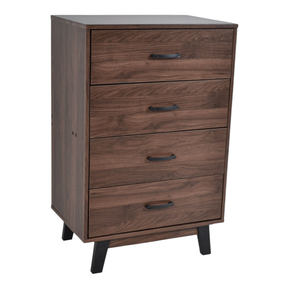 Συρταριέρα ξύλινη σε καρυδί χρώμα με τέσσερα βαθιά συρτάρια (εξωτερικό ύψος 13εκ. εσωτερικό 11εκ.), κομψά πόδια και χερούλια σε μαύρο χρώμα. Είναι λειτουργική με μοντέρνο σχεδιασμό, ιδανική για πρακτική αποθήκευση.