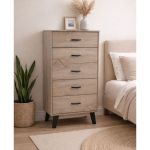 Συρταριέρα ξύλινη σε φυσικό χρώμα με πέντε βαθιά συρτάρια (εξωτερικό ύψος 13εκ. εσωτερικό 11εκ.), κομψά πόδια και χερούλια σε μαύρο χρώμα. Είναι λειτουργική με μοντέρνο σχεδιασμό, ιδανική για πρακτική αποθήκευση.