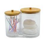 Διάφανο ακρυλικό βάζο διπλό με καπάκια από ξύλο μπαμπού, ιδανικά για μπατονέτες ή βαμβάκι ντεμακιγιάζ. Είναι διάφανα για να βλέπετε στο εσωτερικό τους, καθαρίζονται εύκολα και είναι ιδιαίτερα ανθεκτικά.