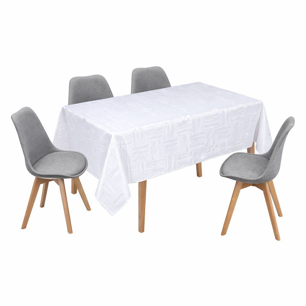 Τραπεζομάντηλο ζακάρ, αδιάβροχο και αλέκιαστο από 100% polyester, σε λευκό χρώμα με διακόσμηση γεωμετρικό μοτίβο. Λόγω της σύνθεσης του δεν χρειάζεται σιδέρωμα, είναι ιδιαίτερα ανθεκτικό στη χρήση και εύχρηστο για το καθημερινό σας τραπέζι.