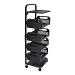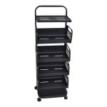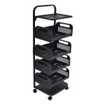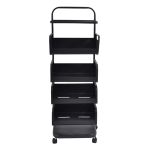 Πρακτικό μεταλλικό τρόλεϊ αποθήκευσης και οργάνωσης σε μαύρο ματ χρώμα.Διαθέτει τέσσερα καλάθια με ενσωματωμένες χειρολαβές για εύκολη πρόσβαση κ δύο ράφια.Ιδανικό για οργάνωση στο σπίτι ή το γραφείο, προσφέρει ευελιξία χάρη στους περιστρεφόμενους τροχούς