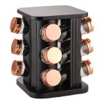 Περιστρεφόμενη μεταλλική βάση σε μαύρο χρώμα, που περιλαμβάνει δώδεκα γυάλινα βαζάκια για αποθήκευση μπαχαρικών. Τα βαζάκια διαθέτουν μεταλλικό καπάκι σε απόχρωση rose gold, προσφέροντας στυλ και πρακτικότητα στην οργάνωση της κουζίνας.