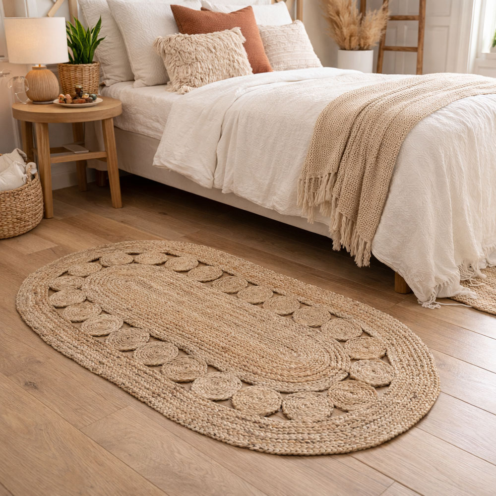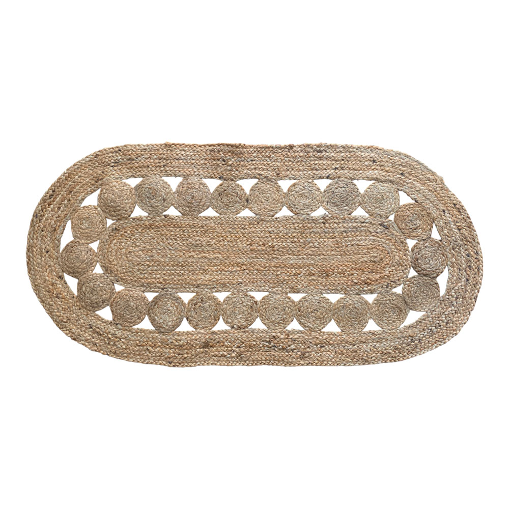 Χαλί από φυσική γιούτα σε οβάλ σχήμα, με ιδιαίτερο διακοσμητικό σχέδιο που συνδυάζει πλεγμένες επιφάνειες και κυκλικά μοτίβα, αναδεικνύοντας τον αυθεντικό και φυσικό του χαρακτήρα. Η υφή της γιούτας προσφέρει ανθεκτικότητα και σταθερό πάτημα, καθιστώντας το ιδανικό για καθημερινή χρήση. Ο φυσικός χρωματισμός και ο ξεχωριστός σχεδιασμός του το καθιστούν ιδανική επιλογή για καθιστικό, κουζίνα, διάδρομο ή επαγγελματικό χώρο, προσθέτοντας ζεστασιά και boho αισθητική.