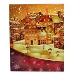 Χάρτινη χριστουγεννιάτικη τσάντα δώρου υψηλής ποιότητας σε κόκκινι με χρυσό χρώμα σχέδιο χιονισμέμου χωριού και κορδόνι για χερούλι