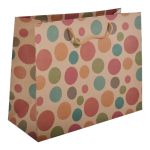 Χάρτινη τσάντα δώρου craft υψηλής ποιότητας σε καφέ χρώμα με διακόσμηση πολύχρωμο πουά και χειρολαβή από κορδόνι.