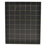 Χάρτινη τσάντα δώρου με ματ πλαστικοποίηση σε μαύρο χρώμα, διακοσμημένη με κομψό χρυσό καρό μοτίβο. Διαθέτει ανθεκτική χειρολαβή από μαύρο κορδόνι, προσφέροντας στυλ και άνεση στη μεταφορά.