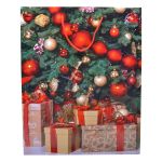 Χάρτινη τσάντα δώρου με πλαστικοποίηση υψηλής ποιότητας, σχέδιο χριστουγεννιάτικες μπάλες και δώρα και χειρολαβή με κόκκινο κορδόνι.