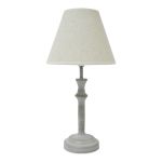Φωτιστικό επιτραπέζιο μεταλλικό σε αντικέ γκρι χρώμα και υφασμάτινο μπεζ κωνικό καπέλο. Κατάλληλος τύπος λάμπας Ε14/40W max