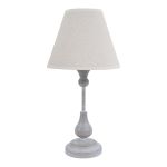 Φωτιστικό επιτραπέζιο μεταλλικό σε αντικέ γκρι χρώμα και υφασμάτινο μπεζ κωνικό καπέλο. Κατάλληλος τύπος λάμπας Ε14/40W max