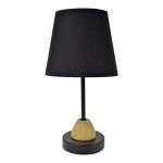 Φωτιστικό επιτραπέζιο μεταλλικό σε μαύρο χρώμα, με ξύλινη διακόσμηση και υφασμάτινο μαύρο καπέλο. Κατάλληλος τύπος λάμπας Ε14/40W max