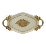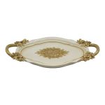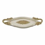Διακοσμητικός δίσκος με λεπτομερείς χρυσές ανάγλυφες διακοσμήσεις και λουλουδάτα μοτίβα στις λαβές. Είναι ιδανικός τόσο για καθημερινή χρήση όσο και για διακοσμητικό κομμάτι στον χώρο σας. Προσθέτει μια vintage αισθητική στην παρουσίαση του τραπεζιού σας.