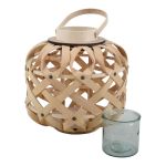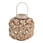 Φανάρι στρογγυλό κατασκευασμένο από ξύλο σε φυσικό χρώμα και λαβή. Το σχέδιο του είναι σε πλεκτό μοτίβο δίνοντας μια μοναδική αισθητική. Στο εσωτερικό του φαναριού υπάρχει ένα γυάλινο ποτηράκι για την τοποθέτηση κεριού.