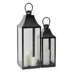 Φανάρια από ανοξείδωτο ατσάλι με γυάλινες επιφάνειες που επιτρέπουν στο φως να διαχέεται ομοιόμορφα και χειρολαβή για ευκολία στη χρήση. Το σετ περιλαμβάνει δύο φανάρια διαστάσεων 18x17x50 εκ. και 23x22x66 εκ. ιδανικά για εσωτερικούς ή εξωτερικούς χώρους.