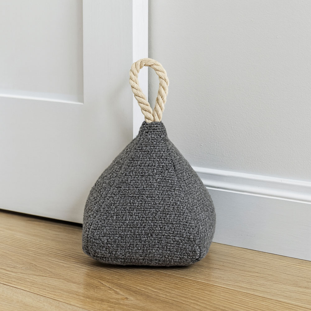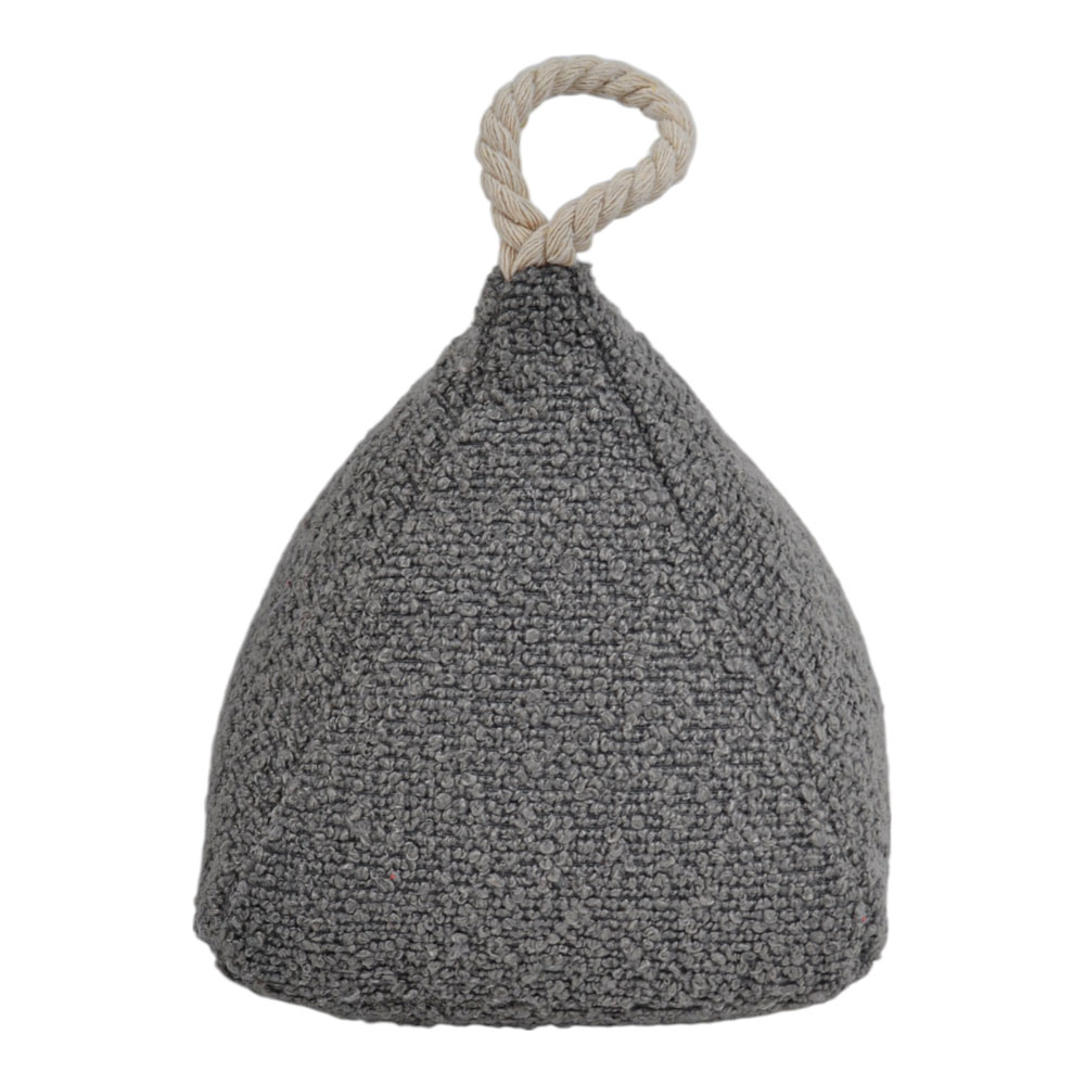 Στοπ πόρτας υφασμάτινο σε γκρι απόχρωση, ανάγλυφη υφή και επάνω χειρολαβή από σχοινί για εύκολη μεταφορά. Σταθερό και ανθεκτικό, συγκρατεί την πόρτα στη θέση της, προσθέτοντας μια ζεστή και φυσική πινελιά στη διακόσμηση.