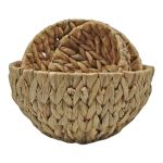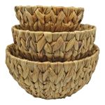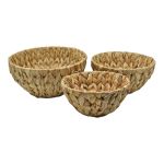 Σετ τριών καλαθιών από υάκινθο, με πλεκτή υφή και φυσική αισθητική. Ιδανικά για αποθήκευση ή διακόσμηση, προσθέτουν ζεστασιά και στυλ σε κάθε χώρο. Κατάλληλα για φρούτα, ψωμί ή μικροαντικείμενα. Διαστάσεις: 28x14εκ., 24x12εκ., 20x10εκ.
