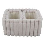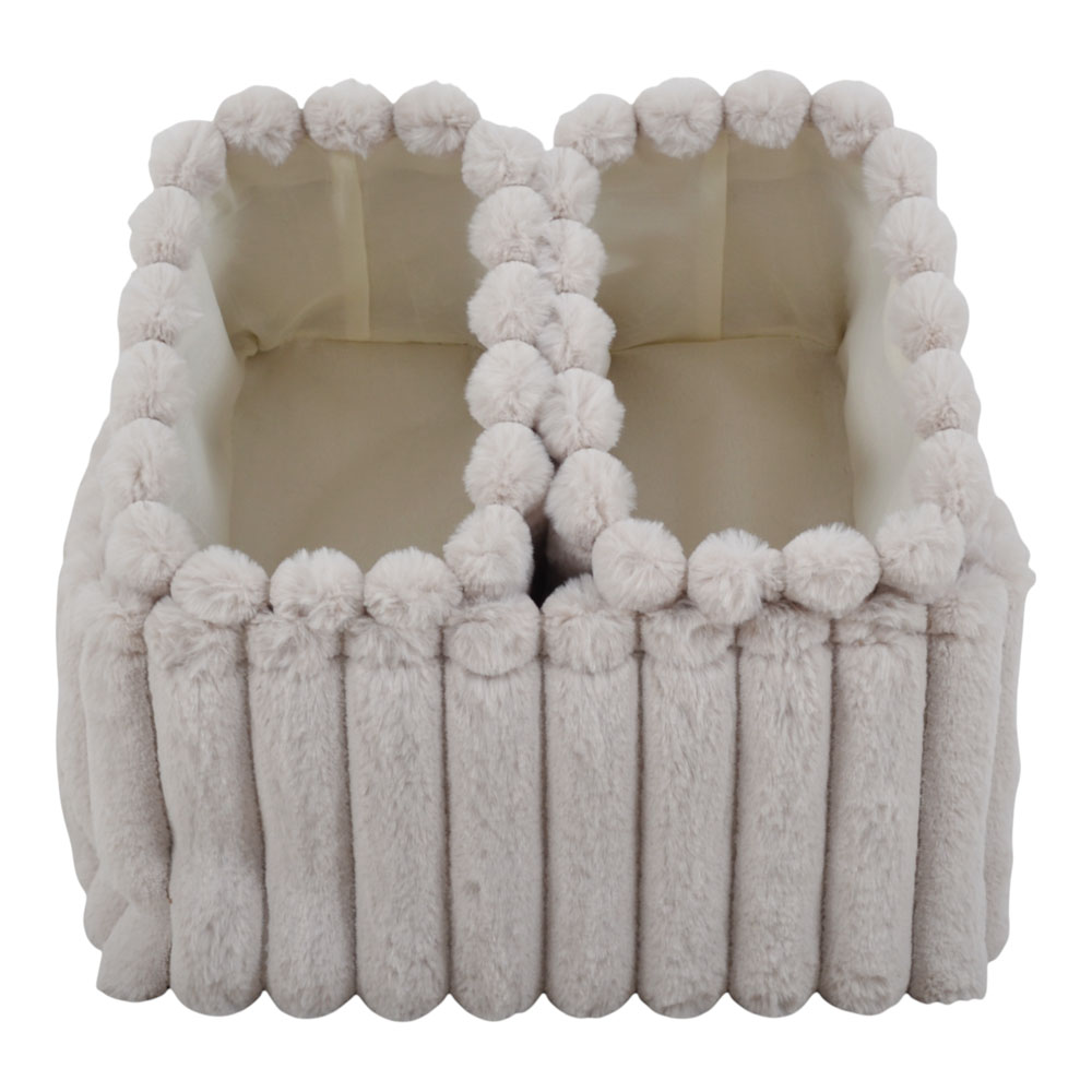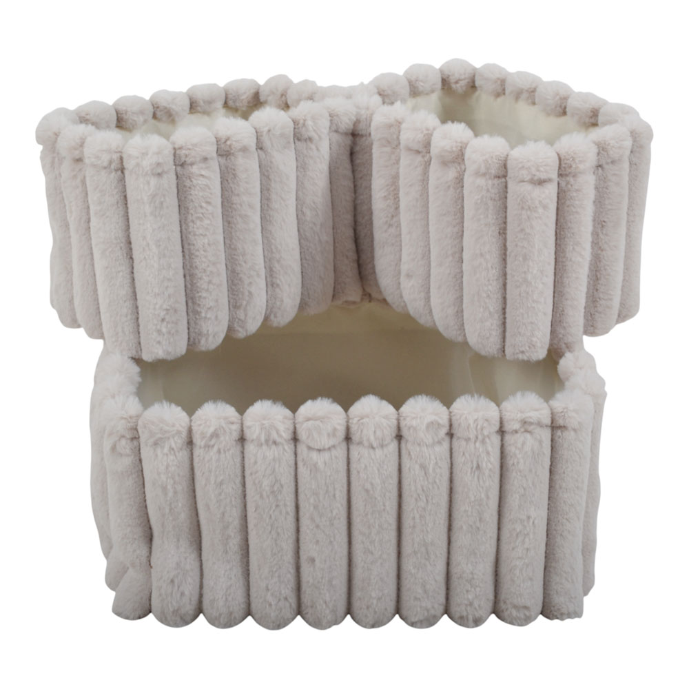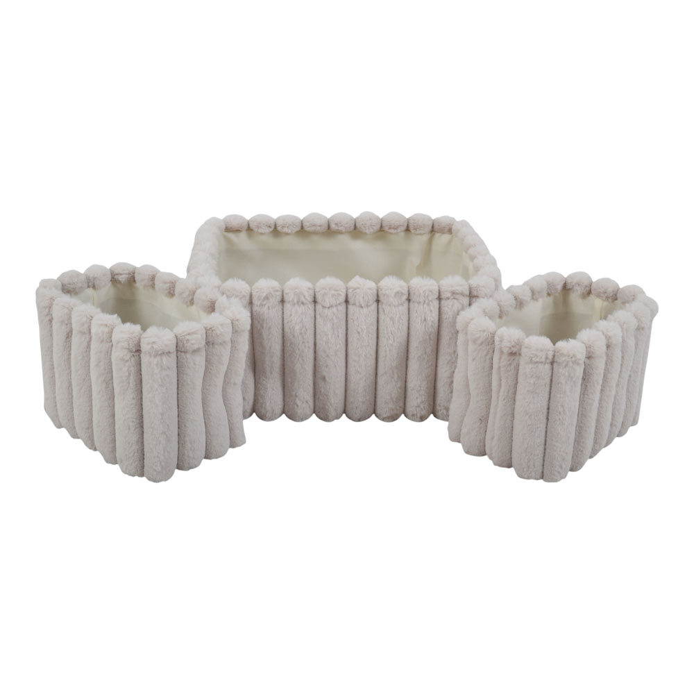 Σετ υφασμάτινων καλαθιών αποθήκευσης με βελούδινη, ανάγλυφη υφή, ιδανικά για την τακτοποίηση και οργάνωση αντικειμένων. Κατάλληλα για καθιστικό, υπνοδωμάτιο ή μπάνιο, μπορούν να χρησιμοποιηθούν σε ράφια, ντουλάπες ή ανοιχτές επιφάνειες, προσφέροντας λειτουργική αποθήκευση με διακριτικό στυλ. Το σετ περιλαμβάνει ένα μεγάλο καλάθι διαστάσεων 36x26x18 εκ. και δύο μικρότερα καλάθια διαστάσεων 24x16x17 εκ.