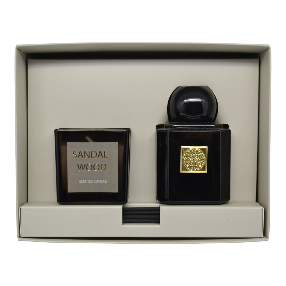 Σετ αρωματικό χώρου με sticks και αρωματικό κερί στο ίδιο ζεστό, γήινο άρωμα σανδαλόξυλου. Η κομψή, σκουρόχρωμη γυάλινη συσκευασία με χρυσές λεπτομέρειες προσφέρει πολυτελή αισθητική και κάνει το σετ ιδανικό για δώρο ή για να ανανεώσει την ατμόσφαιρα του