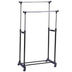 Τροχήλατη κρεμάστρα ρούχων με δύο μεταλλικές ράγες και πλαστική βάση με τέσσερα ροδάκια για εύκολη μεταφορά. Διαθέτει ρυθμιζόμενο ύψος και επιπλέον χώρο στο κάτω ράφι όπου μπορείτε να τοποθετήσετε κουτιά από παπούτσια ή ότι άλλο θέλετε.