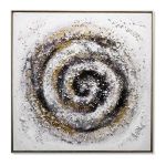 Πίνακας ελαιογραφία σε τυπωμένο καμβά με ασημένια κορνίζα, απεικονίζει αφηρημένο κυκλικό σχηματισμό σε αποχρώσεις του μαύρου, χρυσού και λευκού. Η σαγρέ υφή και οι λαμπερές λεπτομέρειες προσδίδουν βάθος και μοντέρνα αισθητική.