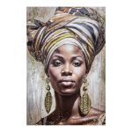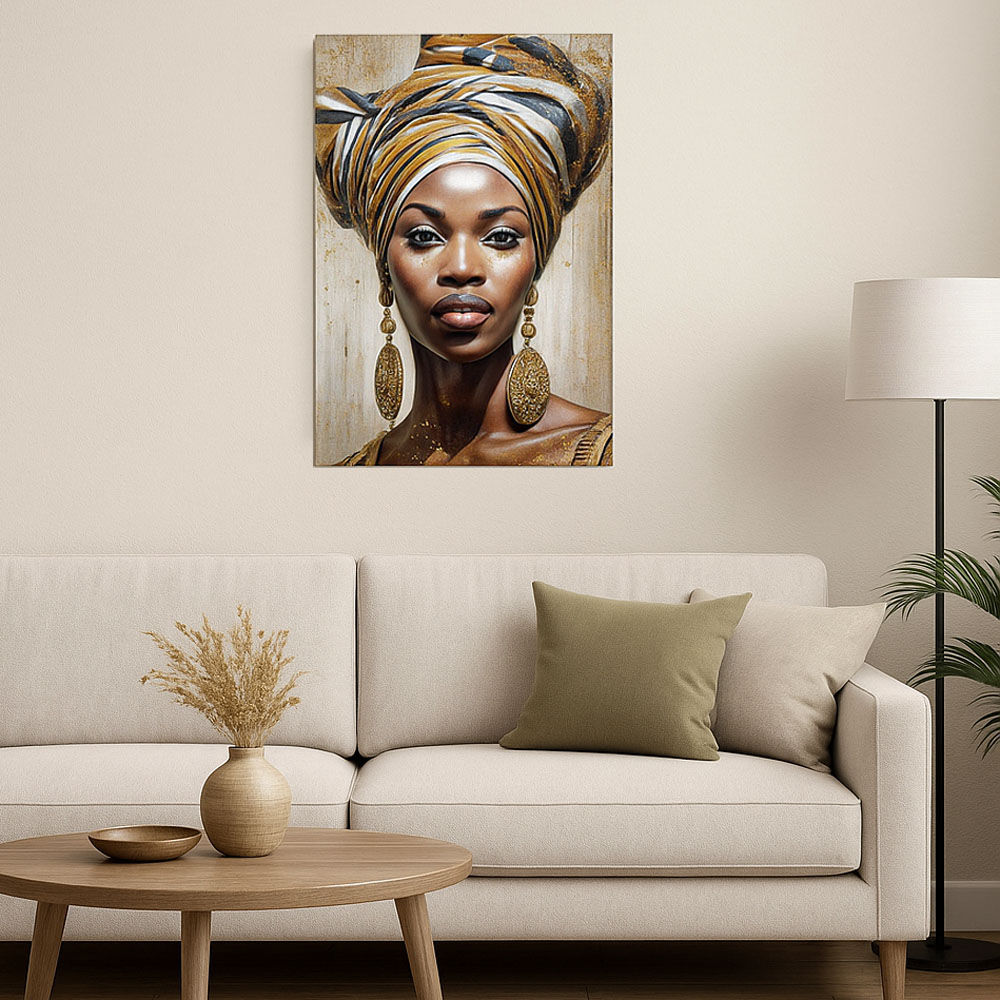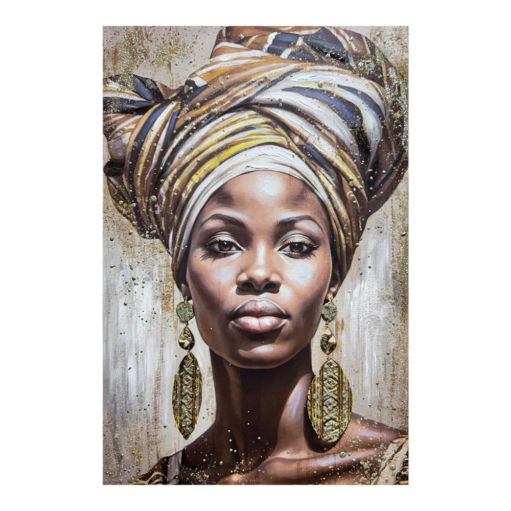 Πίνακας ελαιογραφία σε τυπωμένο καμβά με πορτρέτο γυναίκας σε ζεστές γήινες αποχρώσεις. Οι χρυσές λεπτομέρειες και η ανάγλυφη υφή χαρίζουν ένταση και πολυτέλεια, αναδεικνύοντας το εκφραστικό βλέμμα και τα εντυπωσιακά κοσμήματα.