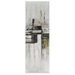 Πίνακας ελαιογραφία σε τυπωμένο καμβά, απεικονίζει ένα αφηρημένο αστικό τοπίο σε γκρι, λευκούς και χρυσούς τόνους. Η ανάγλυφη υφή δίνει βάθος και διάσταση, ενώ η κάθετη διάταξη τονίζει την κομψότητα και τη μοντέρνα αισθητική.