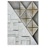 Πίνακας ελαιογραφία σε τυπωμένο καμβά με τρισδιάστατα γεωμετρικά σχήματα σε γκρι και χρυσές αποχρώσεις. Η αντίθεση ανάμεσα στις τετράγωνες και τριγωνικές φόρμες δημιουργεί δυναμική και βάθος, ενώ η ανάγλυφη υφή ενισχύει τη μοντέρνα αισθητική. Ιδανικός