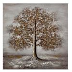 Πίνακας ελαιογραφία σε τυπωμένο καμβά, με εντυπωσιακή απεικόνιση δέντρου σε γκρι και χρυσούς τόνους. Η ανάγλυφη υφή στα φύλλα και στον κορμό χαρίζει βάθος και κίνηση, δημιουργώντας μια αίσθηση φυσικής αρμονίας.