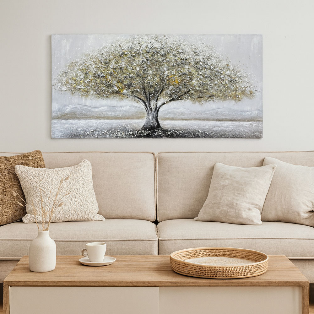 Πίνακας ελαιογραφία σε τυπωμένο καμβά με απεικόνιση δέντρου σε γήινες και γκρι αποχρώσεις. Οι χρυσές λεπτομέρειες και η ανάγλυφη υφή χαρίζουν βάθος και κομψότητα, δημιουργώντας μια ήρεμη και αρμονική ατμόσφαιρα. Ιδανική επιλογή για κάθε χώρο.