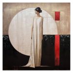 Πίνακας ελαιογραφία σε τυπωμένο καμβά με κομψή γυναικεία φιγούρα σε γεωμετρικό φόντο. Οι μπεζ, μαύροι και χρυσοί τόνοι αποπνέουν διαχρονική κομψότητα, ενώ οι κόκκινες λεπτομέρειες προσθέτουν ένταση. Η σαγρέ υφή ενισχύει την κομψότητα κ το βάθος του έργου.