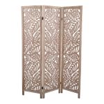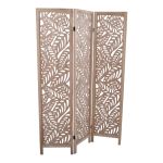 Ξύλινο παραβάν σε φυσικό χρώμα, διακοσμημένο με περίτεχνο διάτρητο σχέδιο φύλλων. Διαθέτει τρία πάνελ τα οποία δημιουργούν μια αίσθηση ιδιωτικότητας αφήνοντας το φως να περνάει διακριτικά. Ιδανικό για να εμπλουτίσει κάθε δωμάτιο με φυσική κομψότητα.